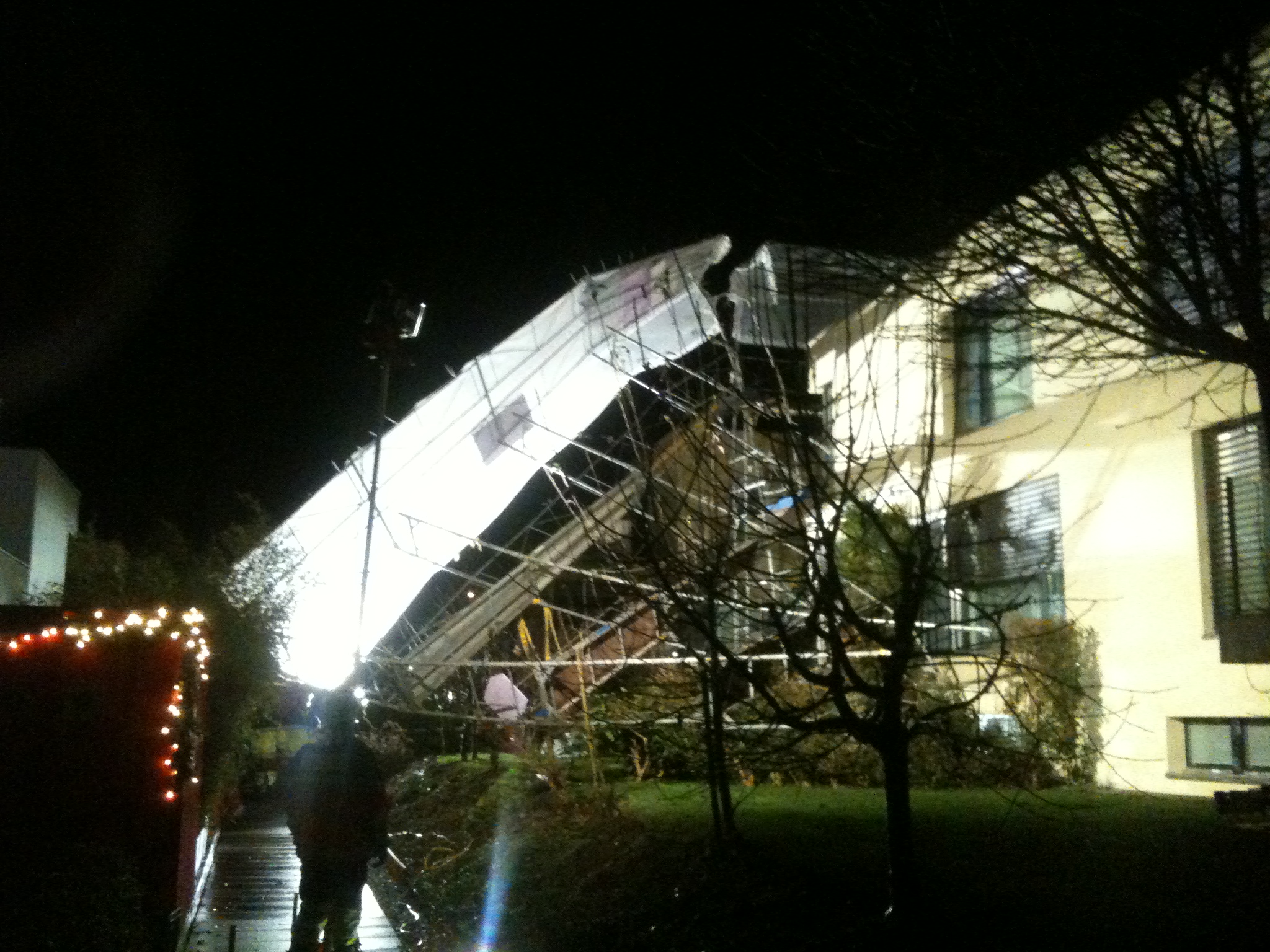 Der Sturm vom 27.12.2012 hat um ca. 18:45 Uhr das Gerüst beim Haus Luchsweg 10 aus der Verankerung gerissen. Ein Teil des Gerüsts kippte Richtung Häuser Luchsweg 9 und 11.
